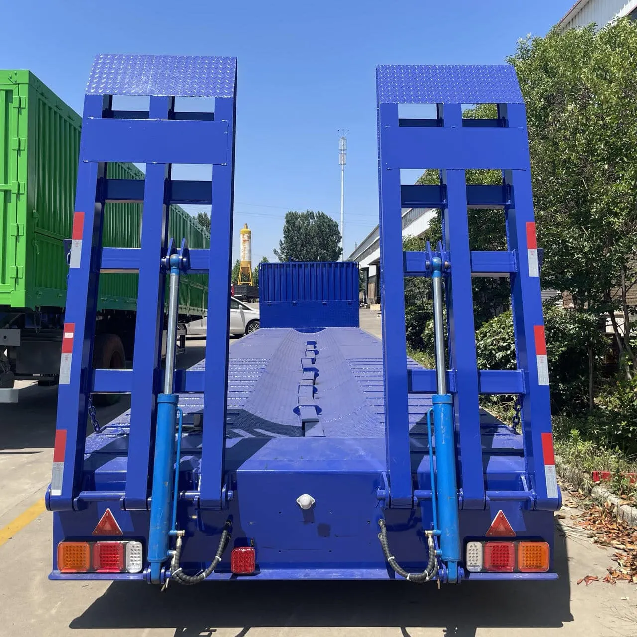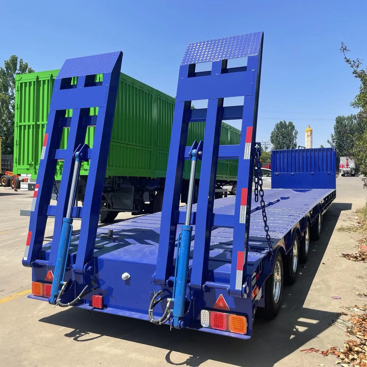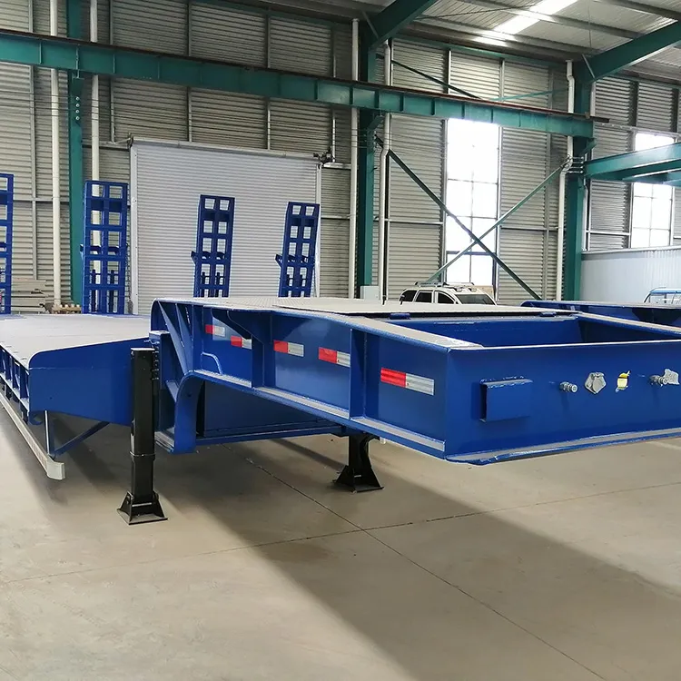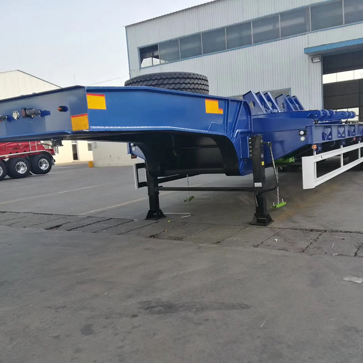 Low-bed semi-trailers are usually used to transport heavy-duty vehicles (such as tractors, buses, special vehicles, etc.), rail vehicles, mining machinery, forestry machinery, construction machinery (such as excavators, bulldozers, loaders, pavers, cranes, etc.) ) and other heavy-duty goods, the lower the center of gravity, the better the stability and safety, and the stronger the ability to transport over-height goods and pass overhead obstacles.
